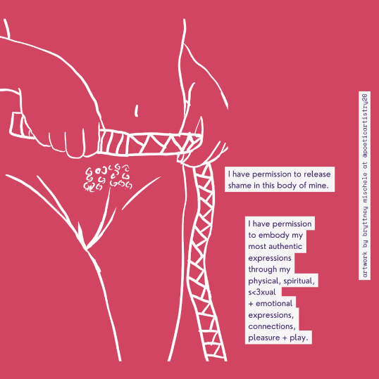 • What parts of my body, sexuality, and identity can I explore more in order to expand the ways I feel confident and authentic in the ways I am showing up in the world?